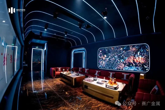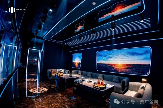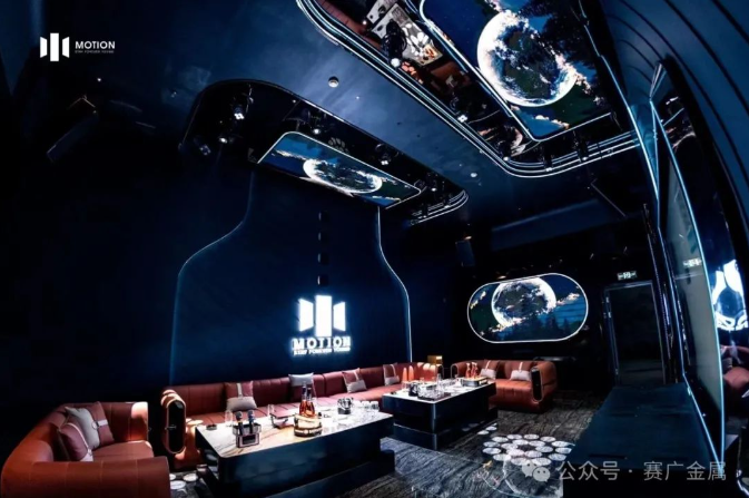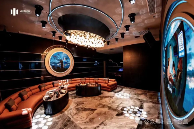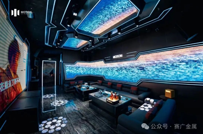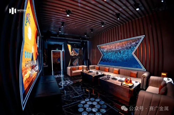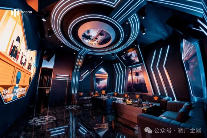 KTV金屬造型運用于墻面和天花部分,起到裝飾和美化環(huán)境的作用,突出了KTV的主題和風(fēng)格,頗有現(xiàn)代時尚風(fēng)范。