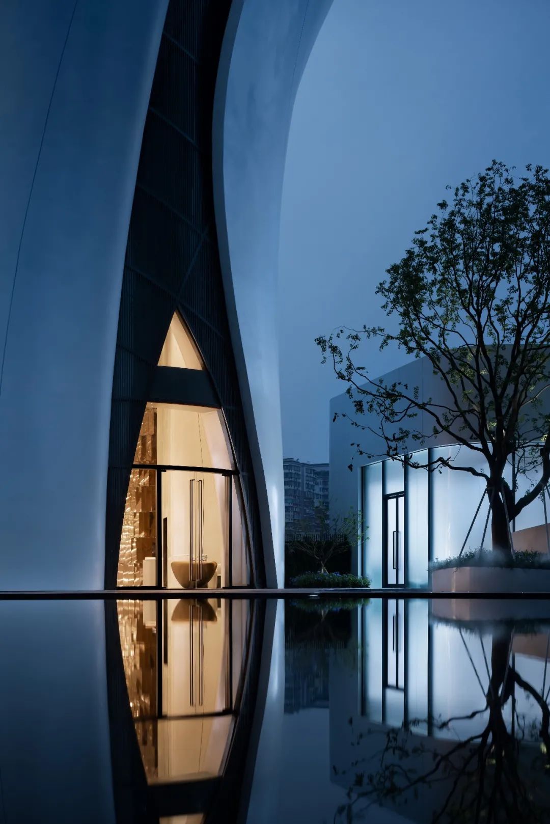 白色圓角線條燈光裝置,以層層包裹的姿態(tài)映射在蔚藍(lán)的水面上,富有科技感與夢幻感,如同璀璨炫目的時光隧道,游向浪漫神秘的遠(yuǎn)方。
