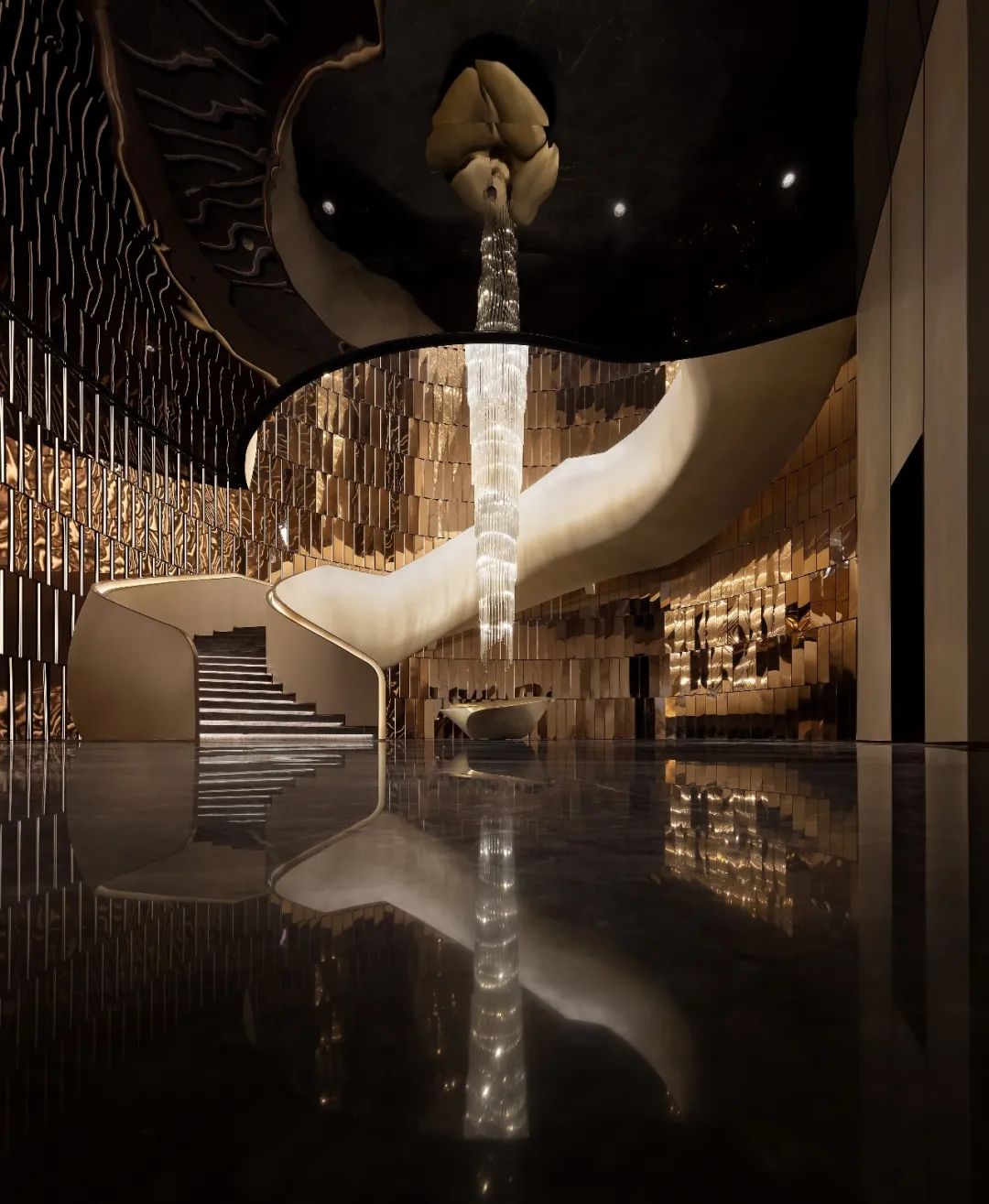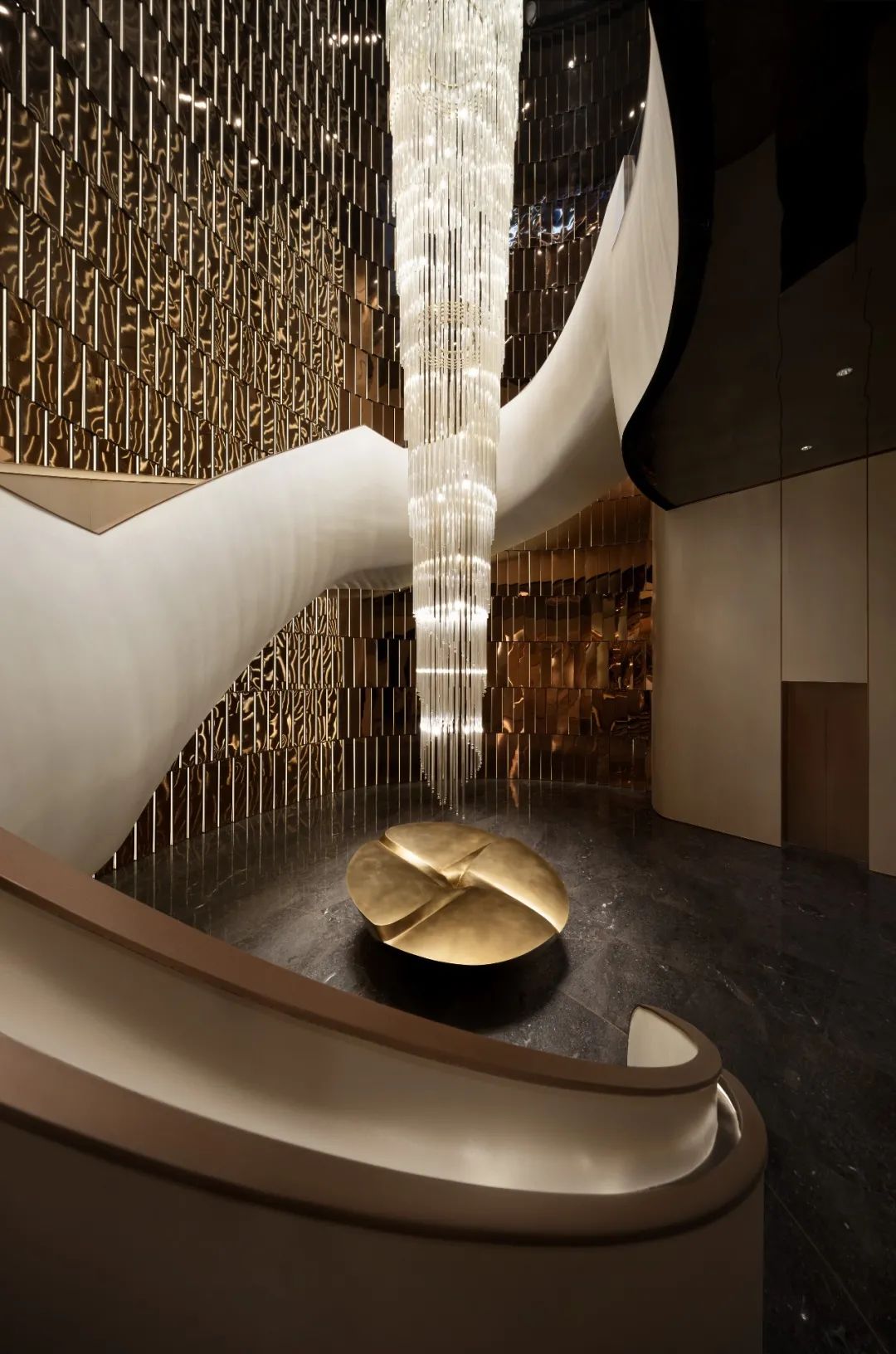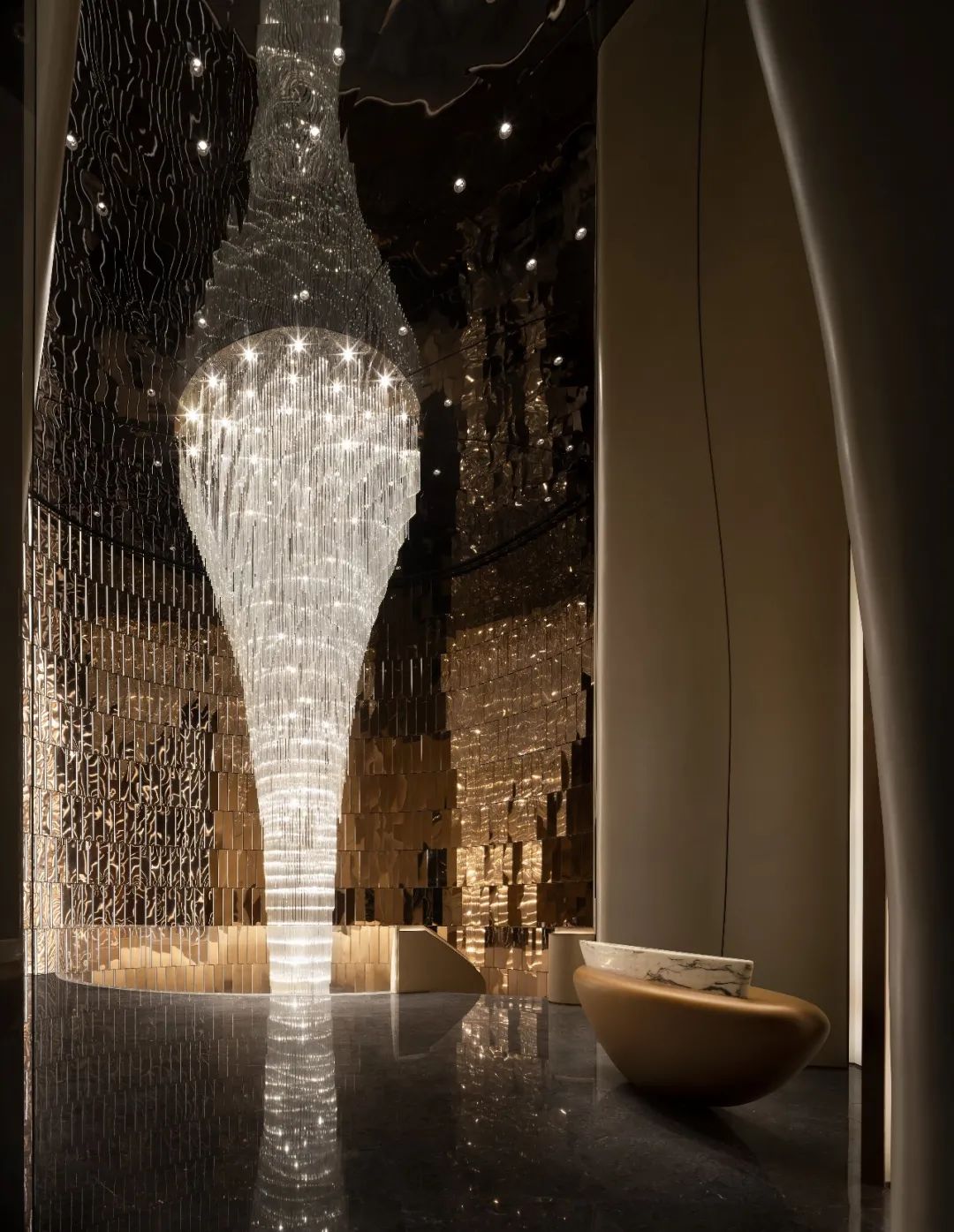 前廳與藝術(shù)樓梯以高達(dá)16米的水晶吊燈作為銜接,立體與平面的交叉,賦予強(qiáng)烈的儀式感,這也是本案最美的精妙。如瀑布一樣從天花傾瀉而下的水晶棱鏡墻,以感悟生命的璀璨,將光芒填滿空間。