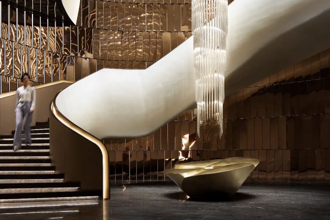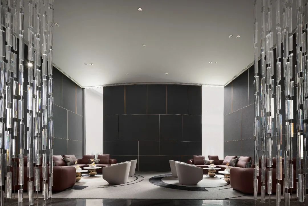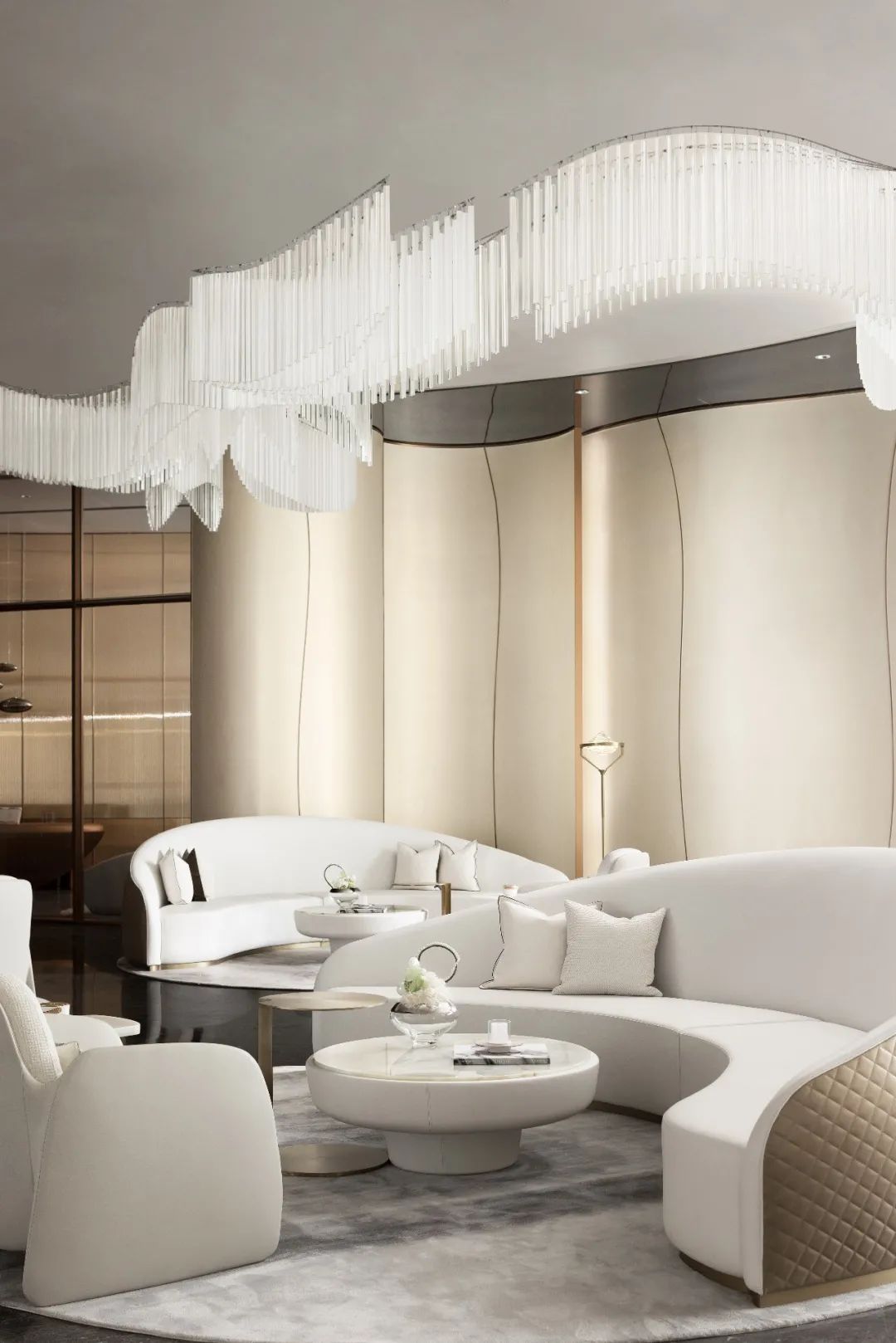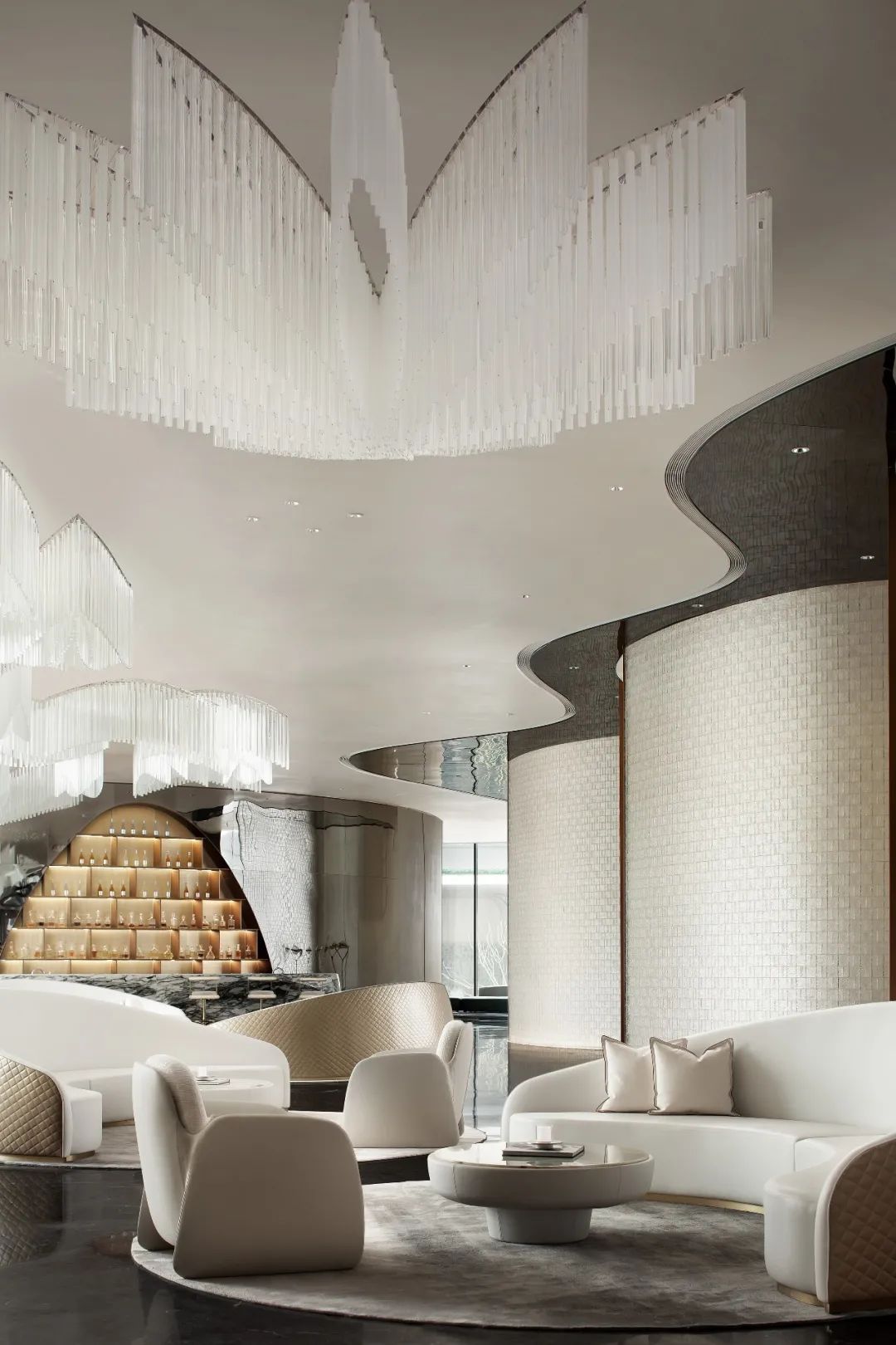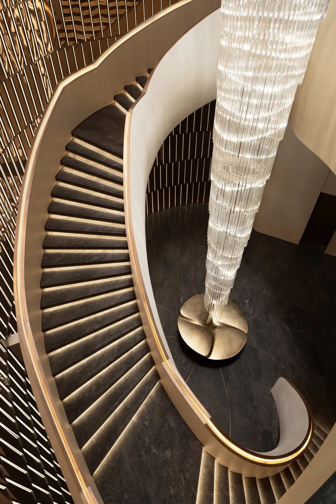 前廳與藝術(shù)樓梯以高達(dá)16米的水晶吊燈作為銜接,立體與平面的交叉,賦予強(qiáng)烈的儀式感,這也是本案最美的精妙。如瀑布一樣從天花傾瀉而下的水晶棱鏡墻,以感悟生命的璀璨,將光芒填滿空間。