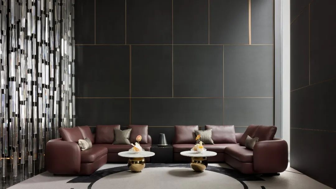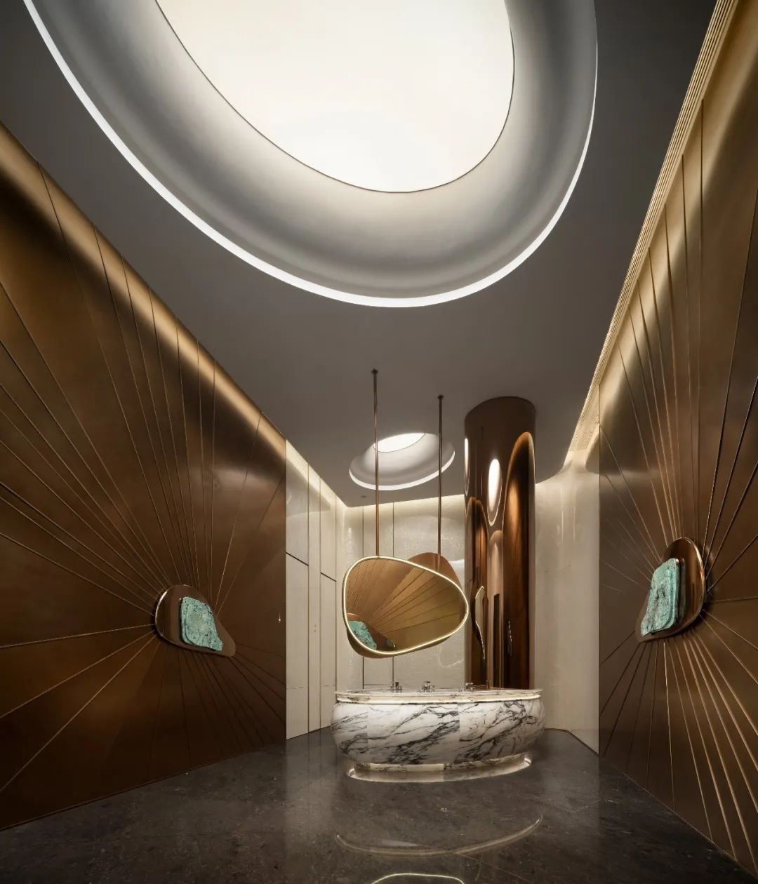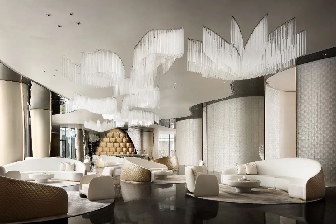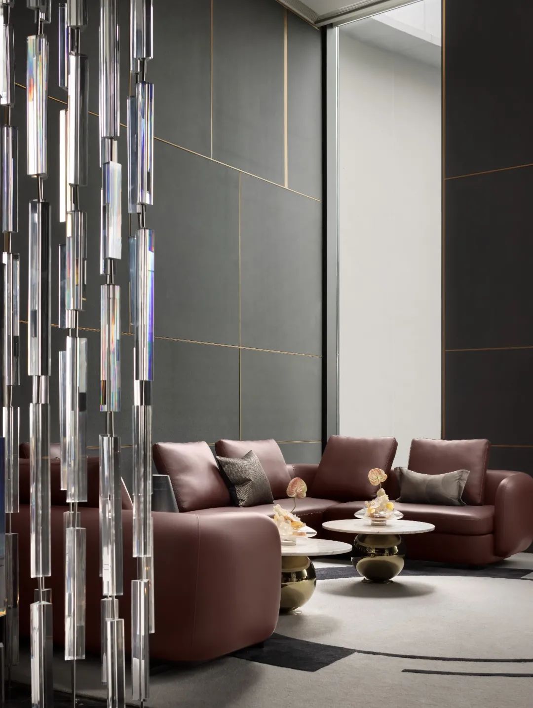 前廳與藝術(shù)樓梯以高達(dá)16米的水晶吊燈作為銜接,立體與平面的交叉,賦予強(qiáng)烈的儀式感,這也是本案最美的精妙。如瀑布一樣從天花傾瀉而下的水晶棱鏡墻,以感悟生命的璀璨,將光芒填滿空間。