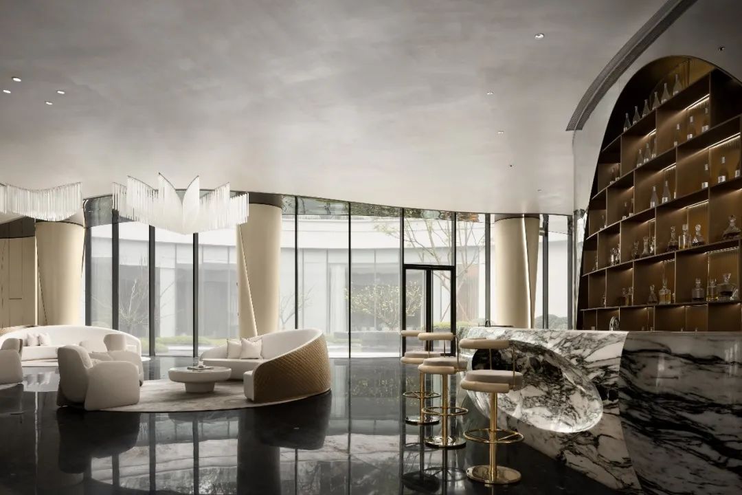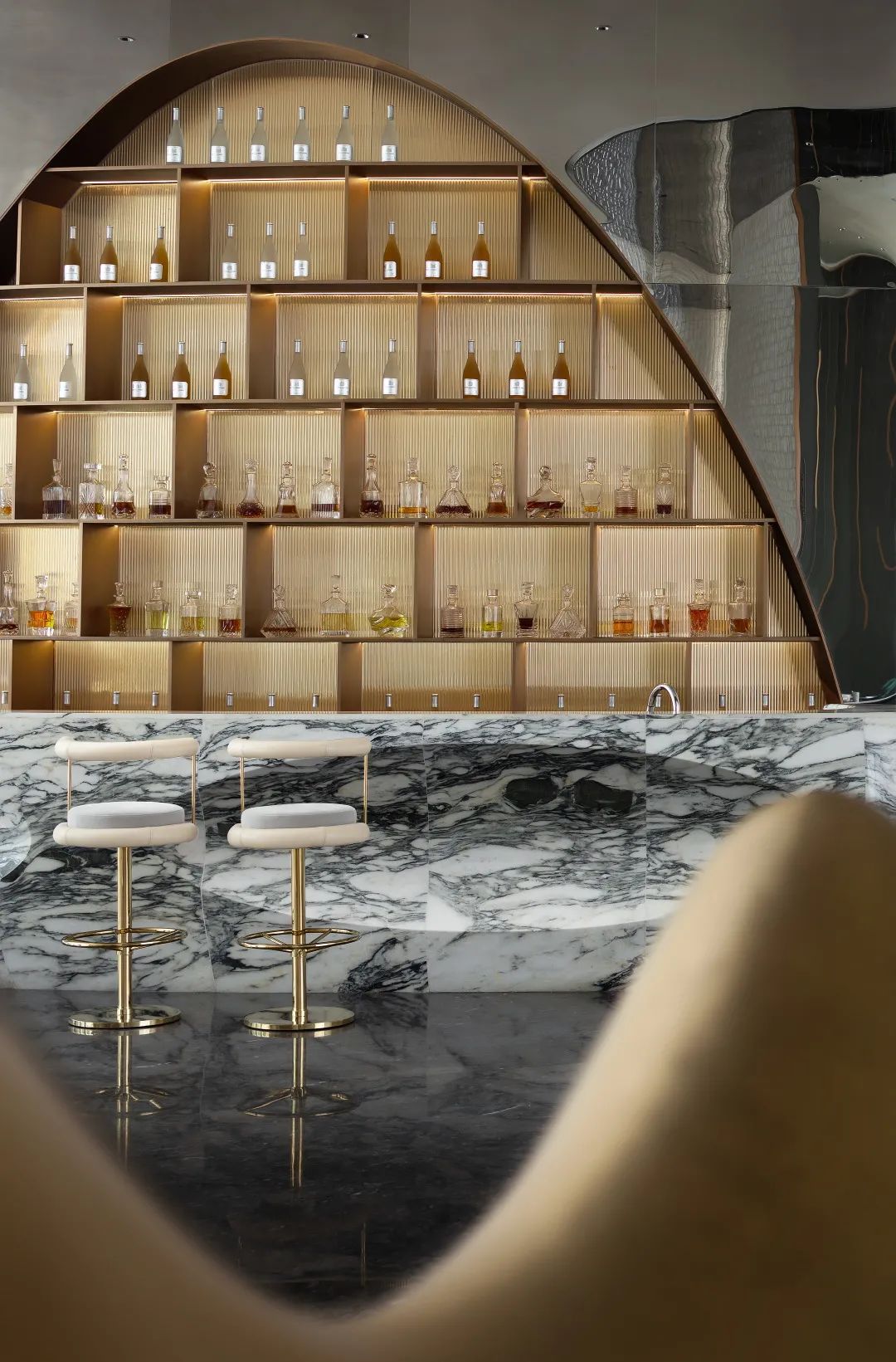 水吧與洽談區(qū)和諧貫通,借助曲線語言的大理石吧臺,傳統(tǒng)水墨繪畫般紋理氤氳其間,金屬與布藝交織的座椅在其中點(diǎn)綴,豐富視覺層次,充滿詩意的造型工藝,使整體呈現(xiàn)出猶如品牌精品櫥窗。