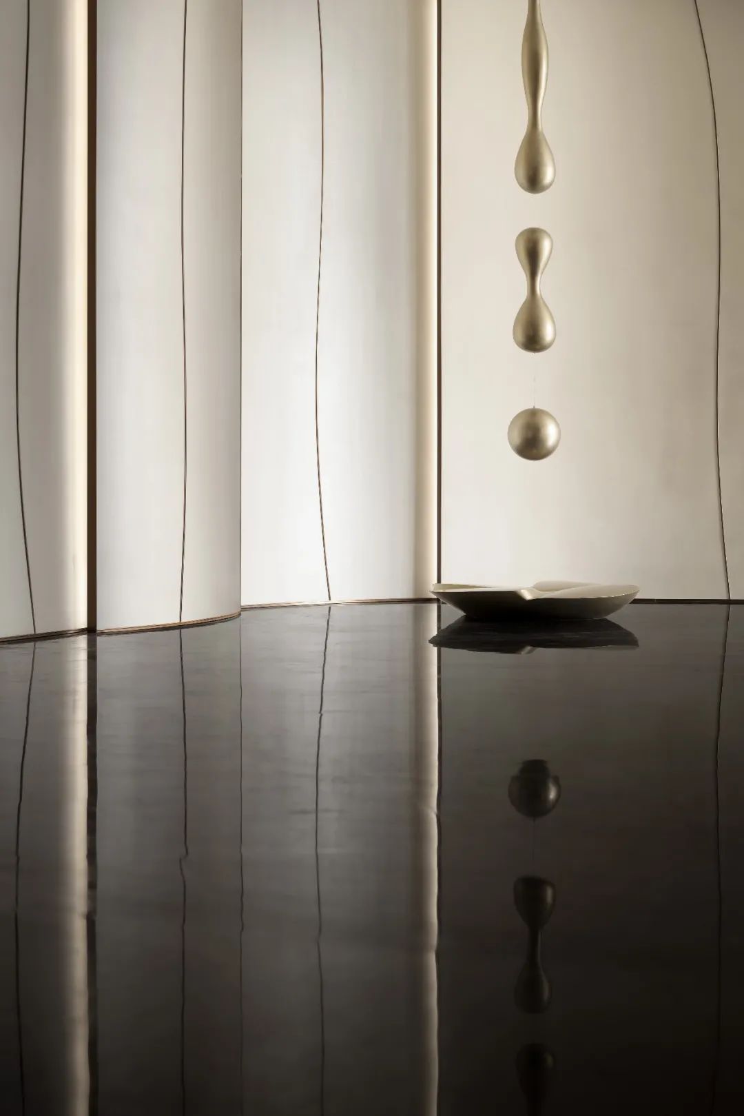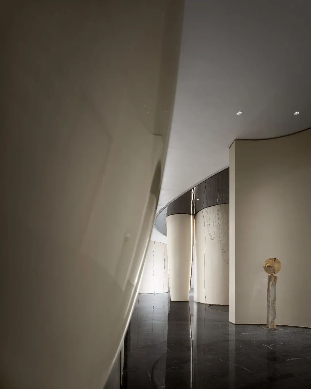 曲線型玻璃雕塑感屏風(fēng)既實(shí)現(xiàn)了動線之間的相互轉(zhuǎn)換,又能很好地區(qū)分空間功能屬性,透而未透的玻璃材質(zhì)將自然光溫柔納入,使VIP室內(nèi)外輕松地融合在一起,為訪者創(chuàng)造安謐靜宜的洽談環(huán)境。