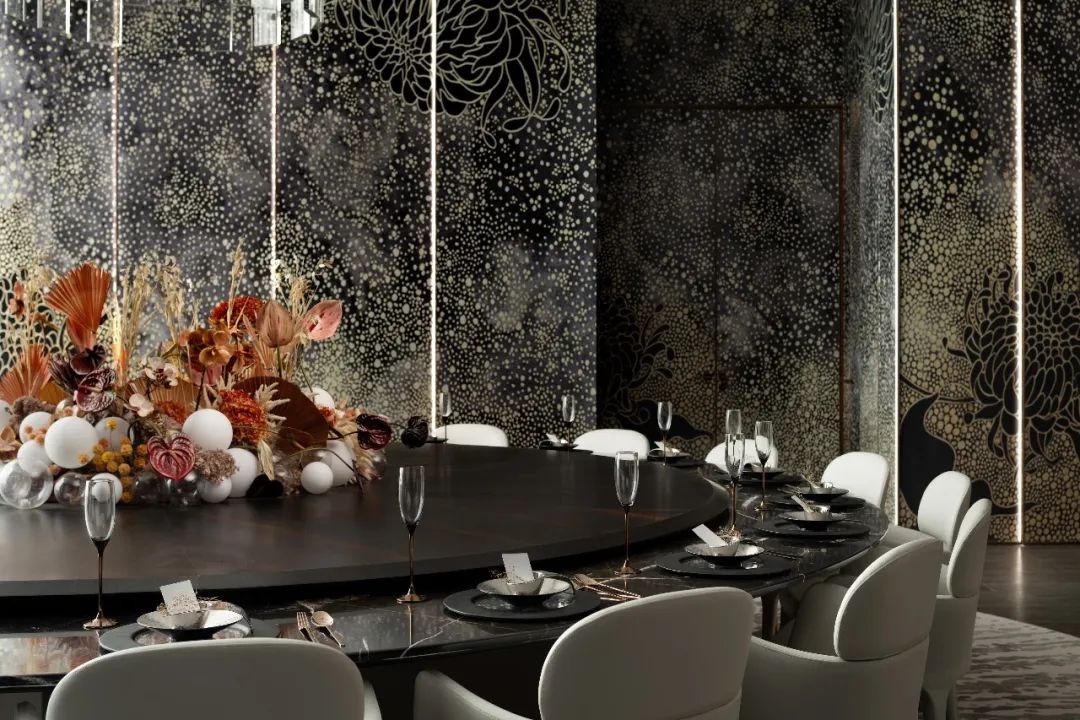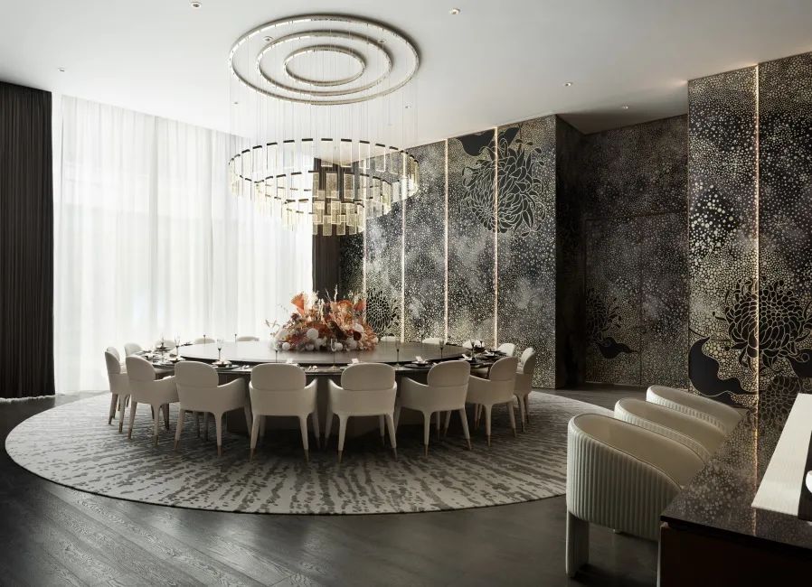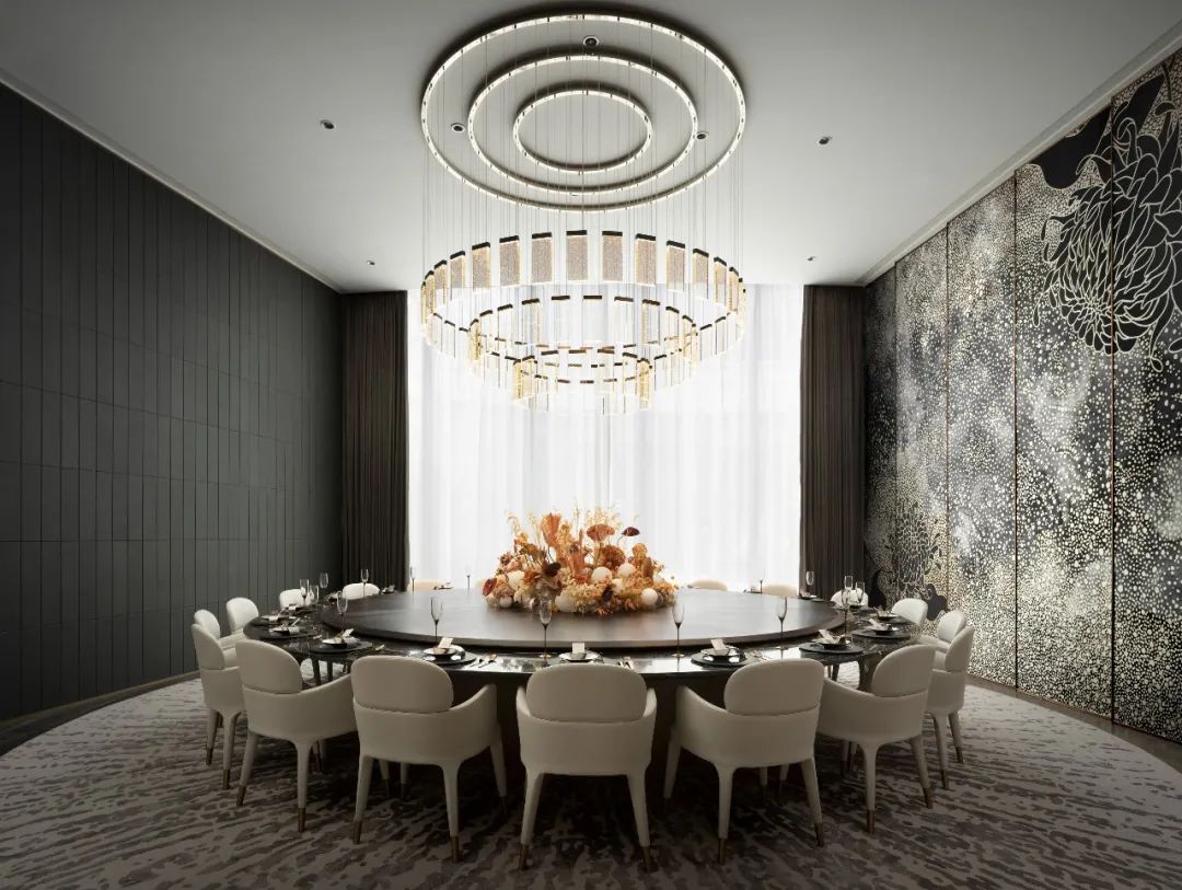 ,是中華文明的精神原型,也是東方美學(xué)中不可缺少的元素,宴會廳從頂部天花至地毯,始終以圓形貫穿,由上至下層層遞進(jìn),東方的大氣豪情與精致細(xì)微相互關(guān)照,流光溢彩的金屬餐具與曼妙多姿的繁花作品,共同傳遞出真實(shí)熱鬧的人間煙火。