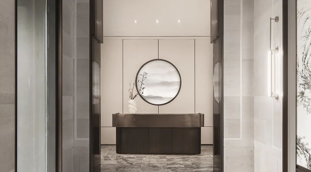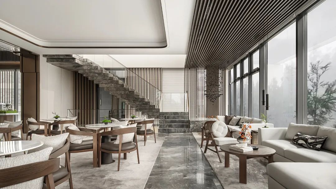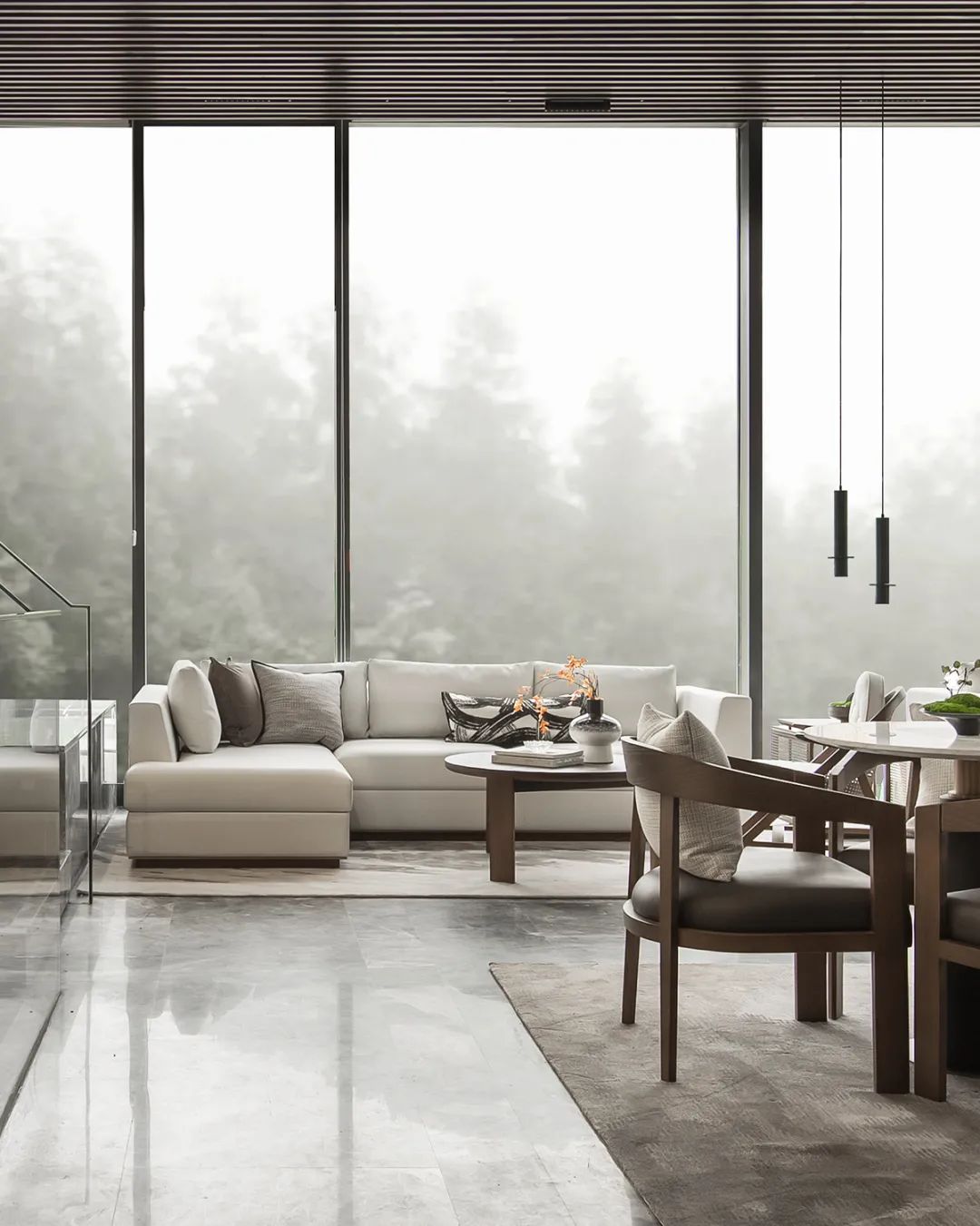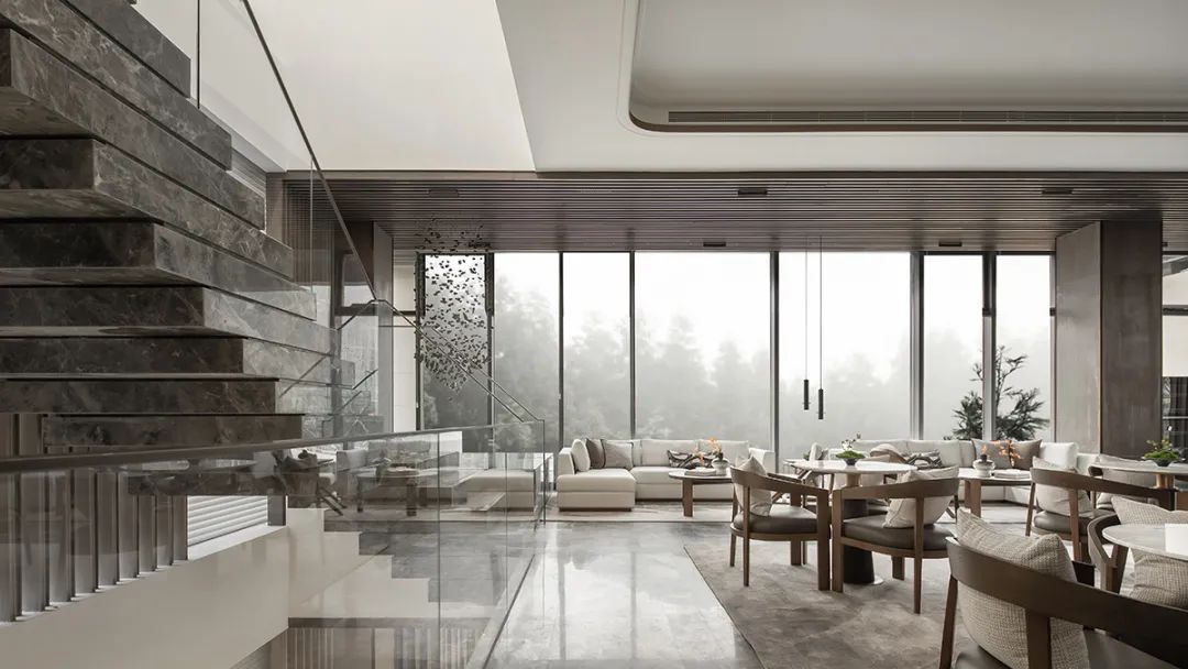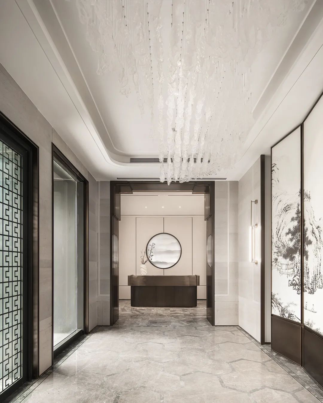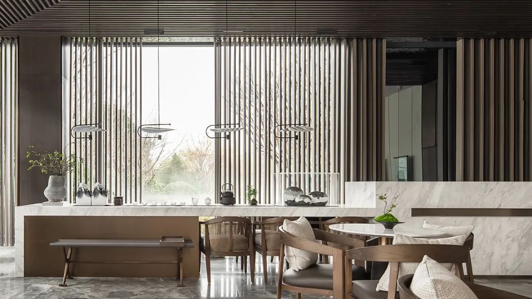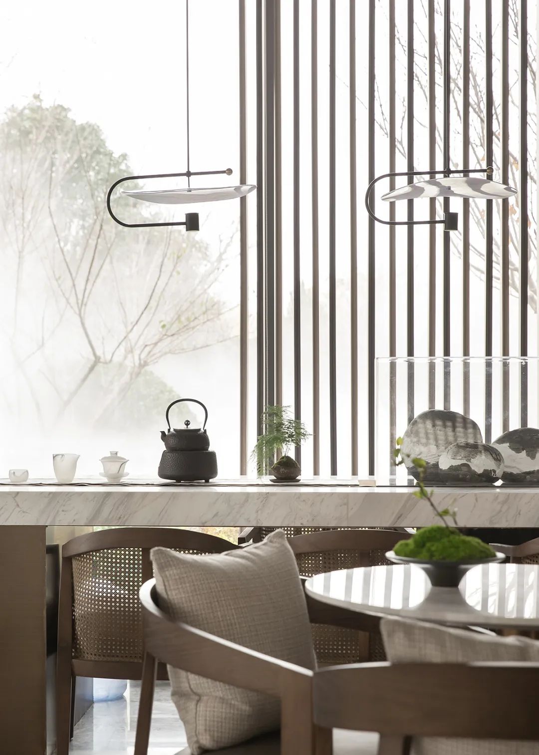 透過玻璃幕墻,最大程度引入自然光線,極目遠眺,飽覽山之綠,坐擁水之秀。將取于自然的元素化為極具美感的線條與體感,賦予空間現(xiàn)代與傳統(tǒng)交融并濟的融合氣質。