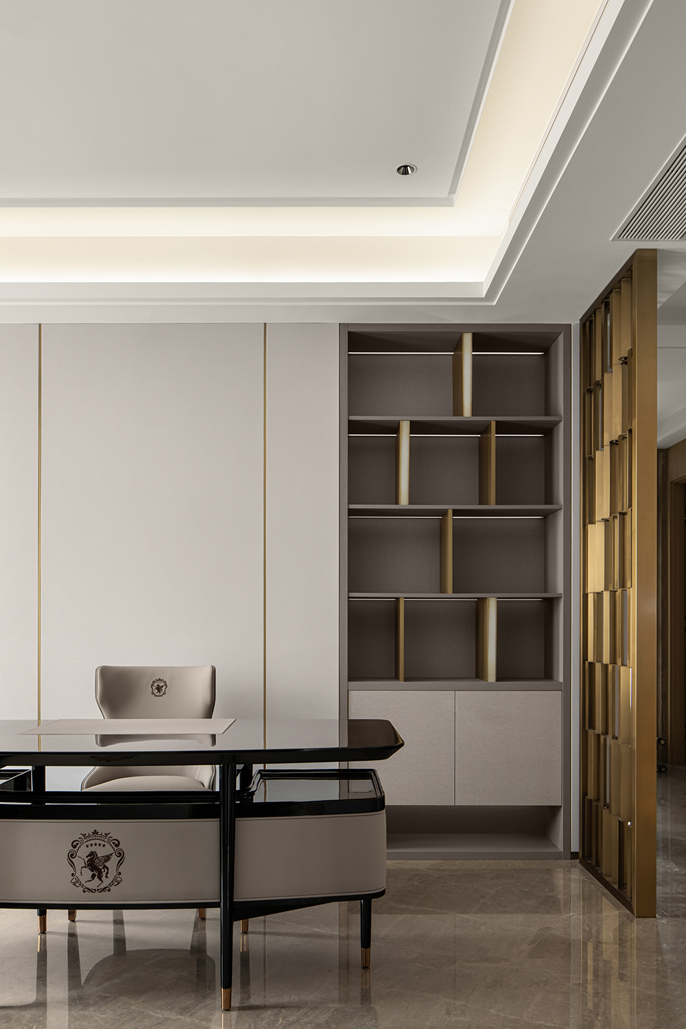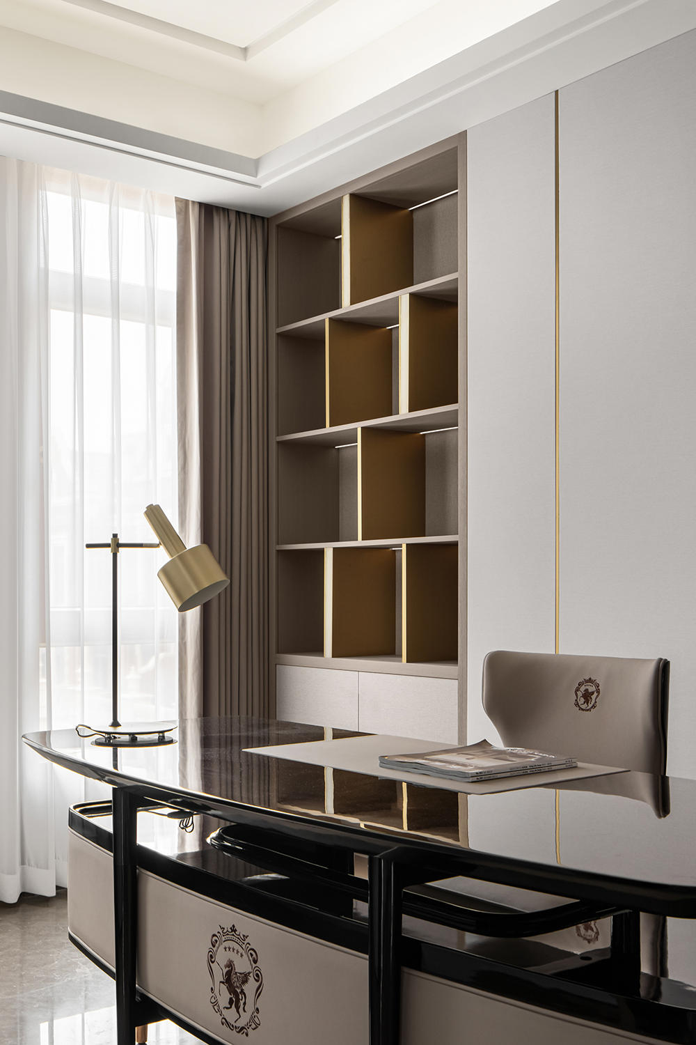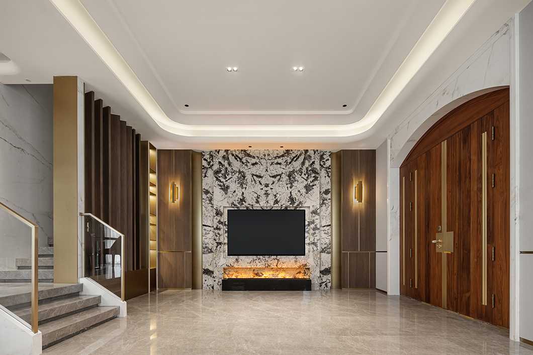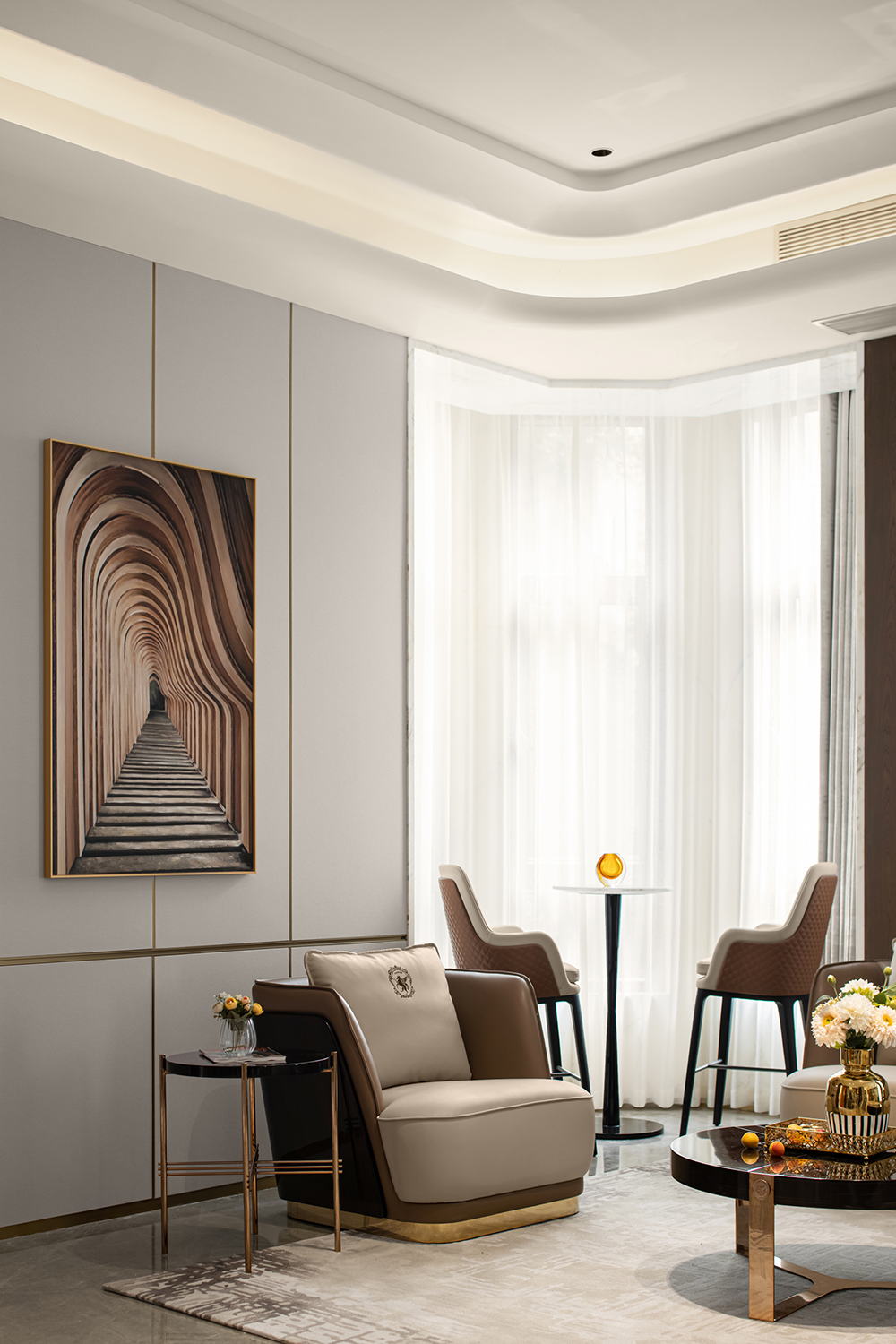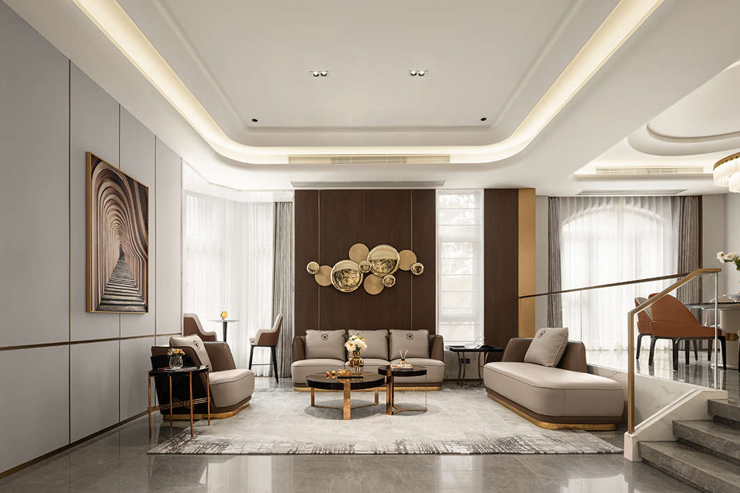 開放融合的客廳以米灰與棕咖為主題色,配以亮面金屬點(diǎn)綴,在自然光影與燈光的協(xié)調(diào)下,通過紗簾把適度明朗的空間氛圍緩緩拉滿,生出層次的美感?;【€圍合的家居造型與頂面天花交相呼應(yīng),呈現(xiàn)穩(wěn)重典雅的精神氣韻。