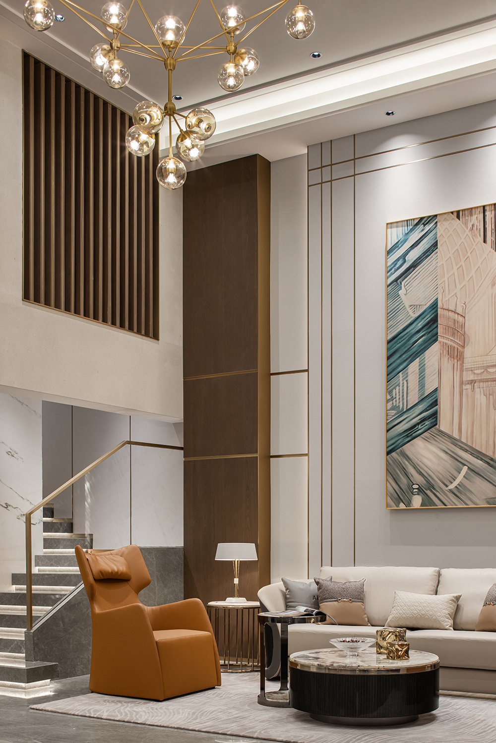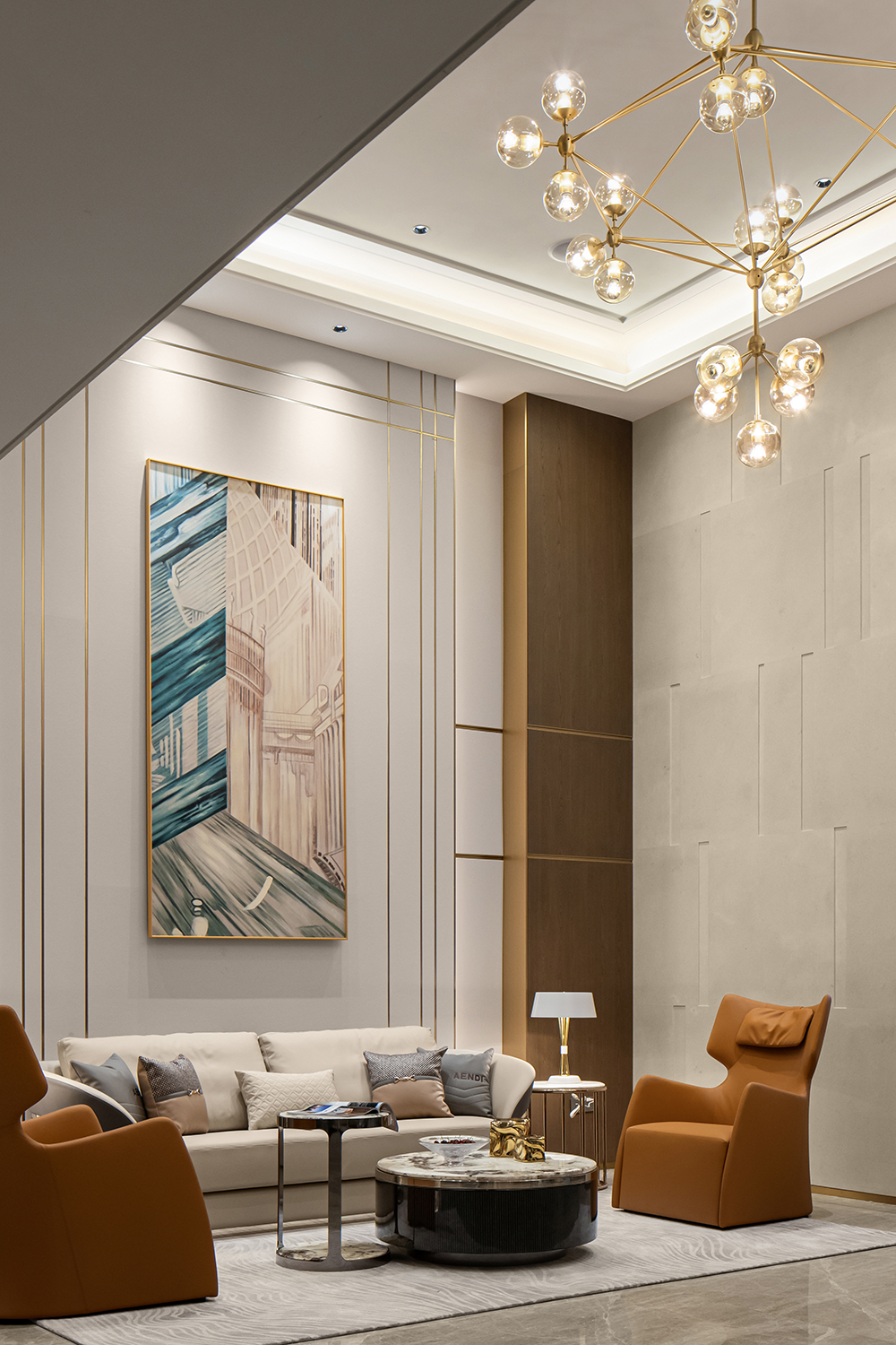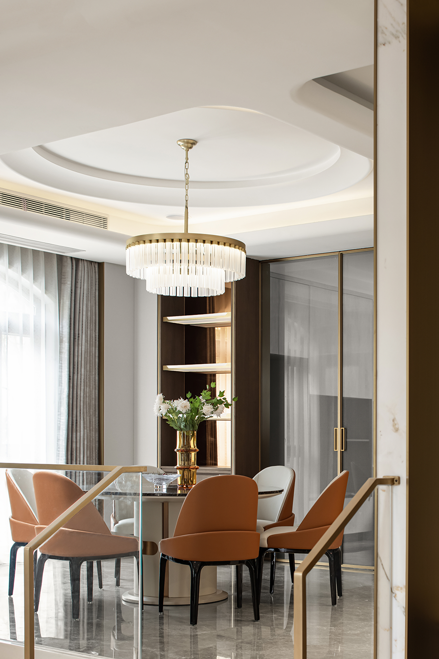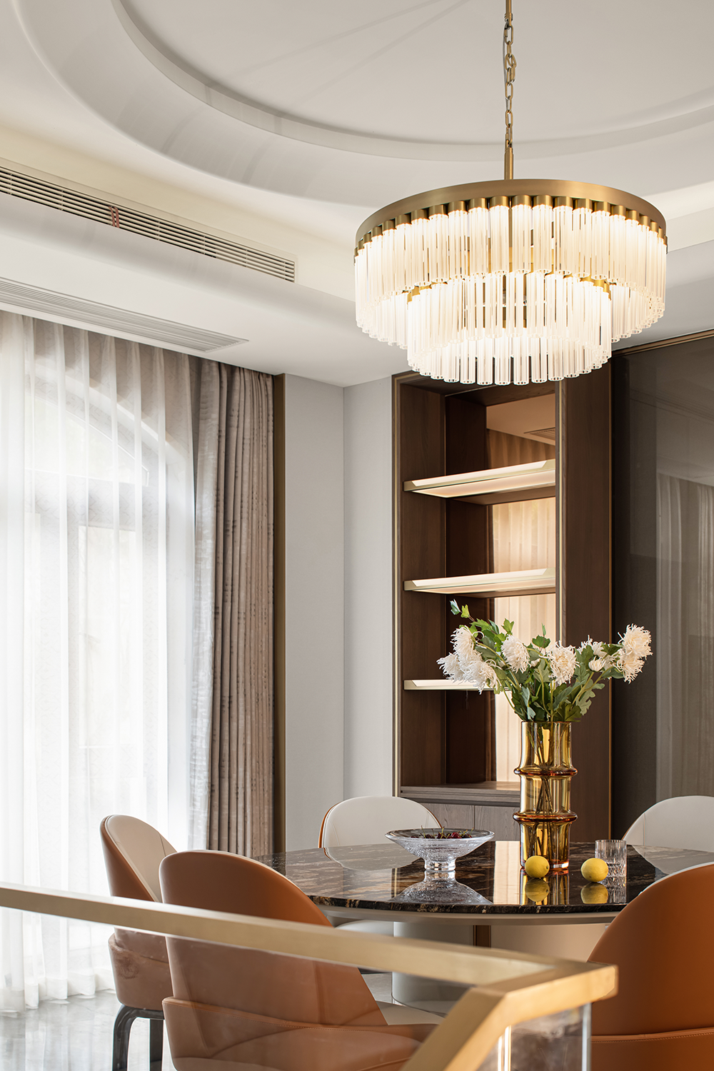 餐廳匯集家人團(tuán)聚的歡融體驗(yàn),作為一天美味私享的空間,呈現(xiàn)最具煙火氣的生活景象。自帶溫度的橙色與黑金奢石臺面冷暖互補(bǔ),中和出舒適的餐區(qū)溫度。質(zhì)感吊燈,通透器皿與藝術(shù)雕塑的加入,衍生出家居陳設(shè)的多元可能。