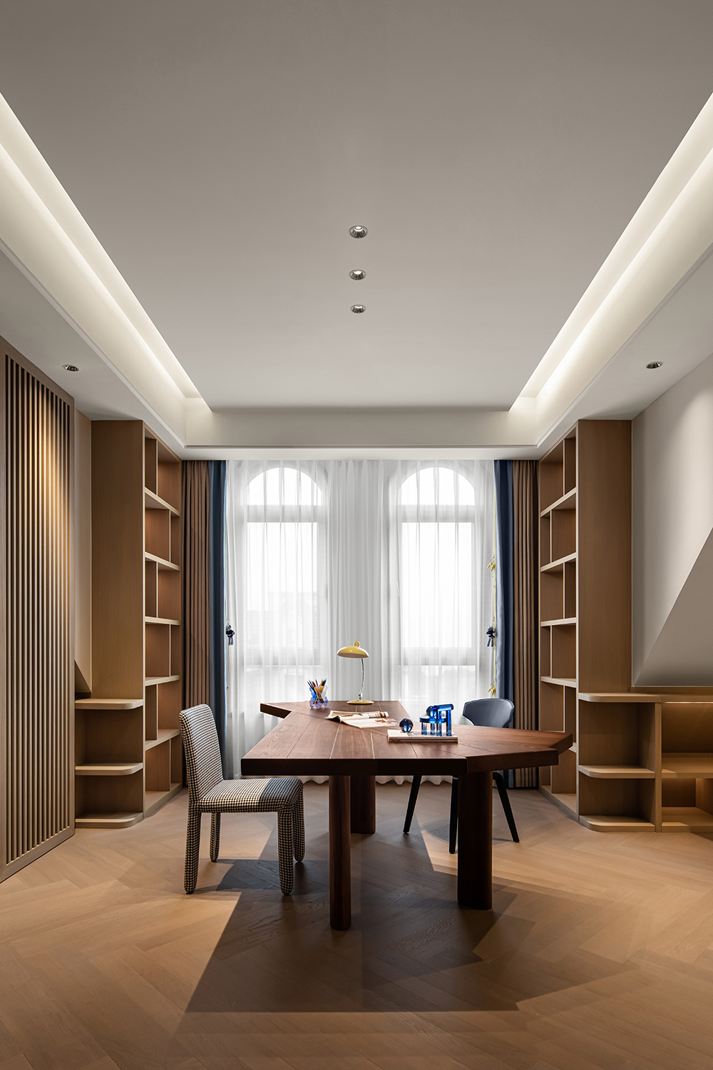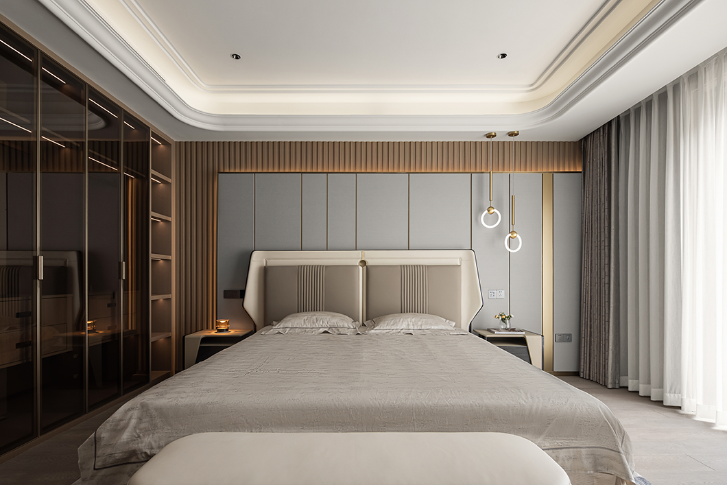 在感性與理性中探尋空間的美學(xué)定義,享受統(tǒng)一色系帶來的寧靜。二層主臥用疏密變化的線條展現(xiàn)節(jié)奏的韻律,整體流線形的家居設(shè)計(jì),勾勒出現(xiàn)代輕奢的個(gè)性氣息。