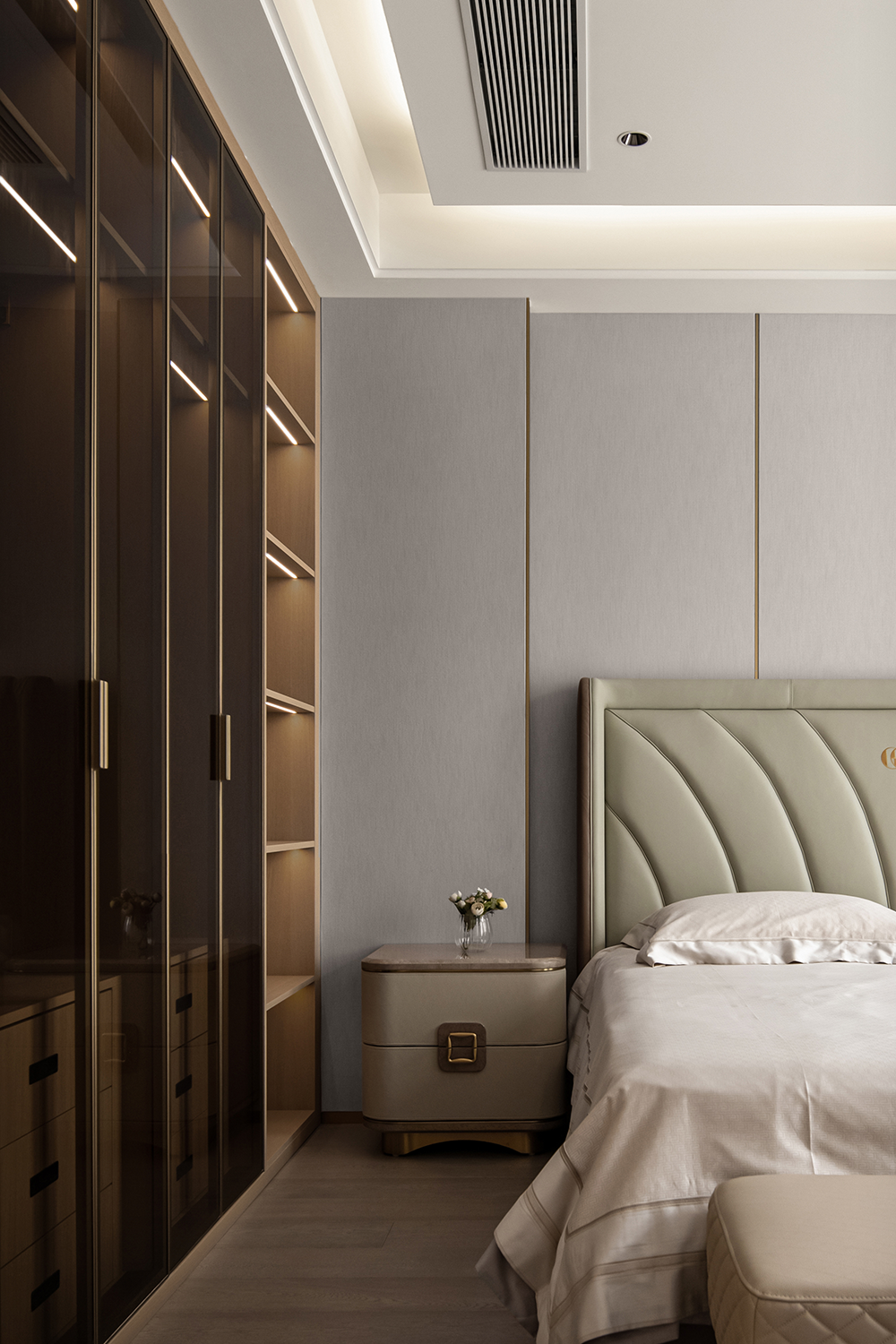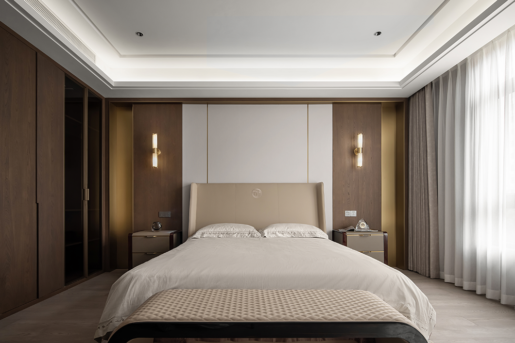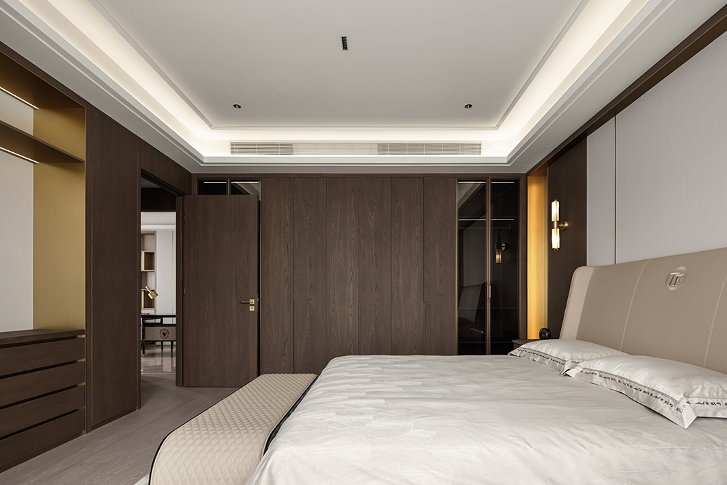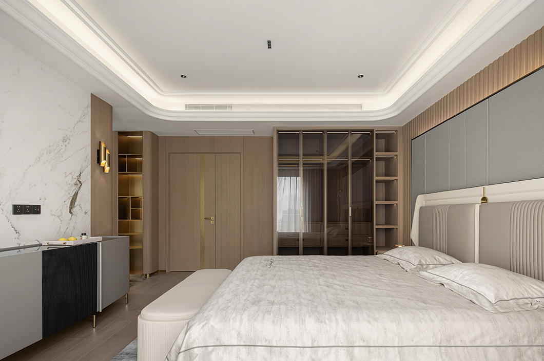 在輕奢的統(tǒng)一語境下,衣帽間,主衛(wèi)與主臥設(shè)計(jì)基調(diào)貫穿統(tǒng)一,內(nèi)斂溫潤的木飾,啞光質(zhì)感的金屬與通透一體的玻璃搭配利落整體,摒棄復(fù)雜的裝飾與色彩,享受獨(dú)一無二的奢雅與舒適。