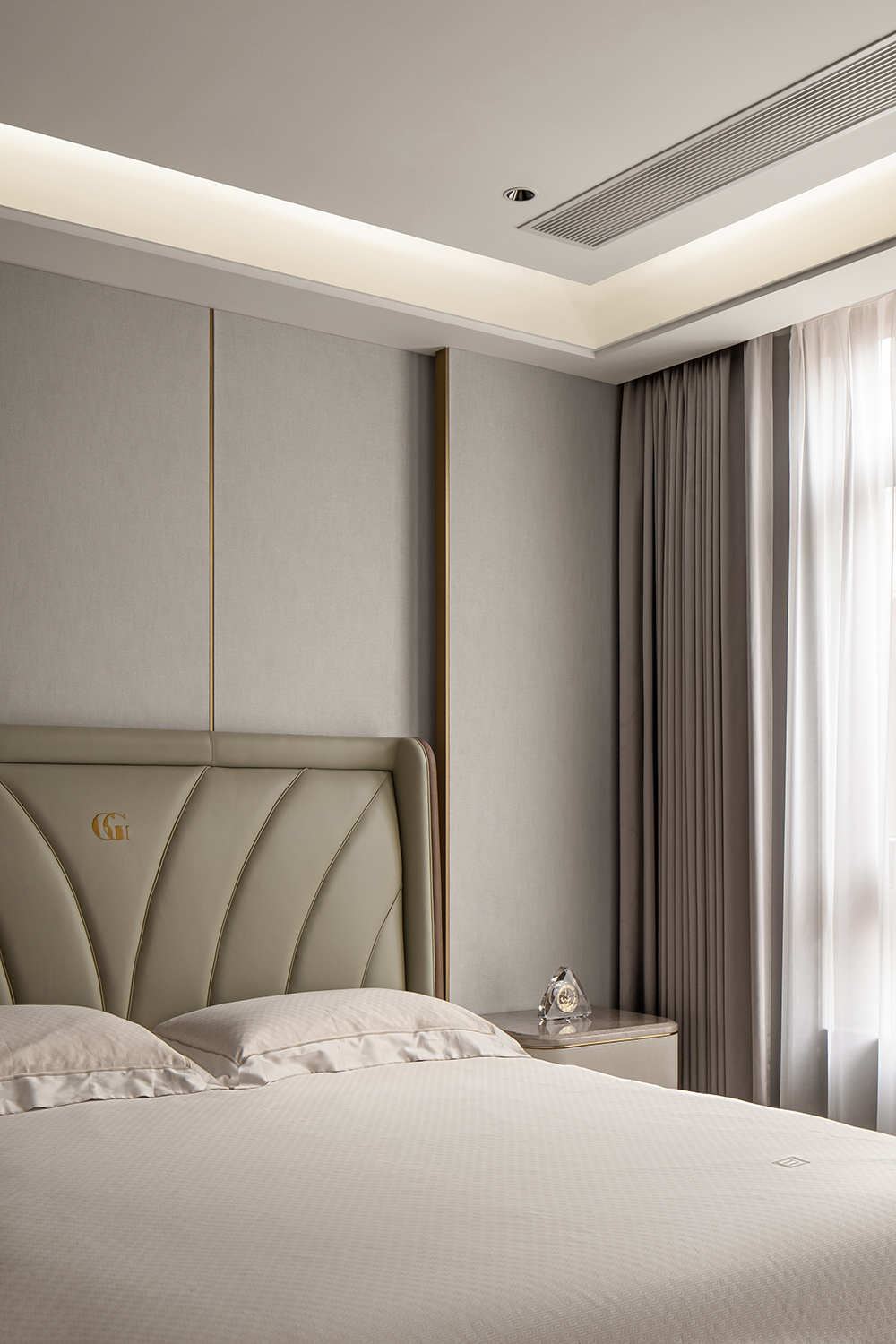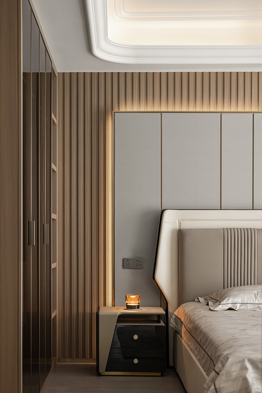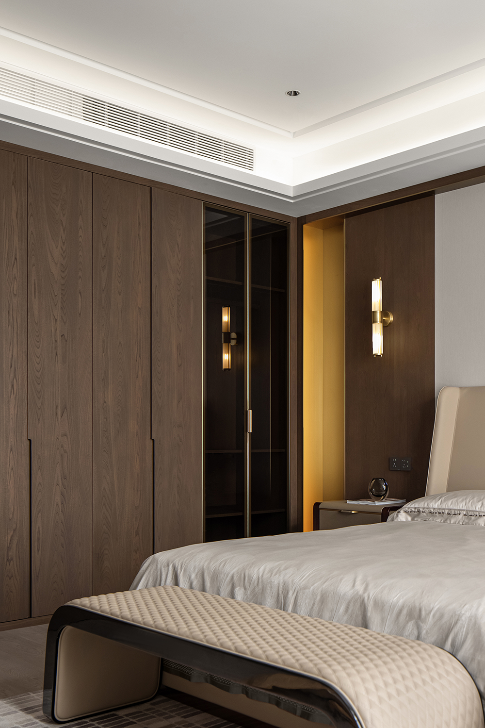 在輕奢的統(tǒng)一語境下,衣帽間,主衛(wèi)與主臥設(shè)計(jì)基調(diào)貫穿統(tǒng)一,內(nèi)斂溫潤的木飾,啞光質(zhì)感的金屬與通透一體的玻璃搭配利落整體,摒棄復(fù)雜的裝飾與色彩,享受獨(dú)一無二的奢雅與舒適。