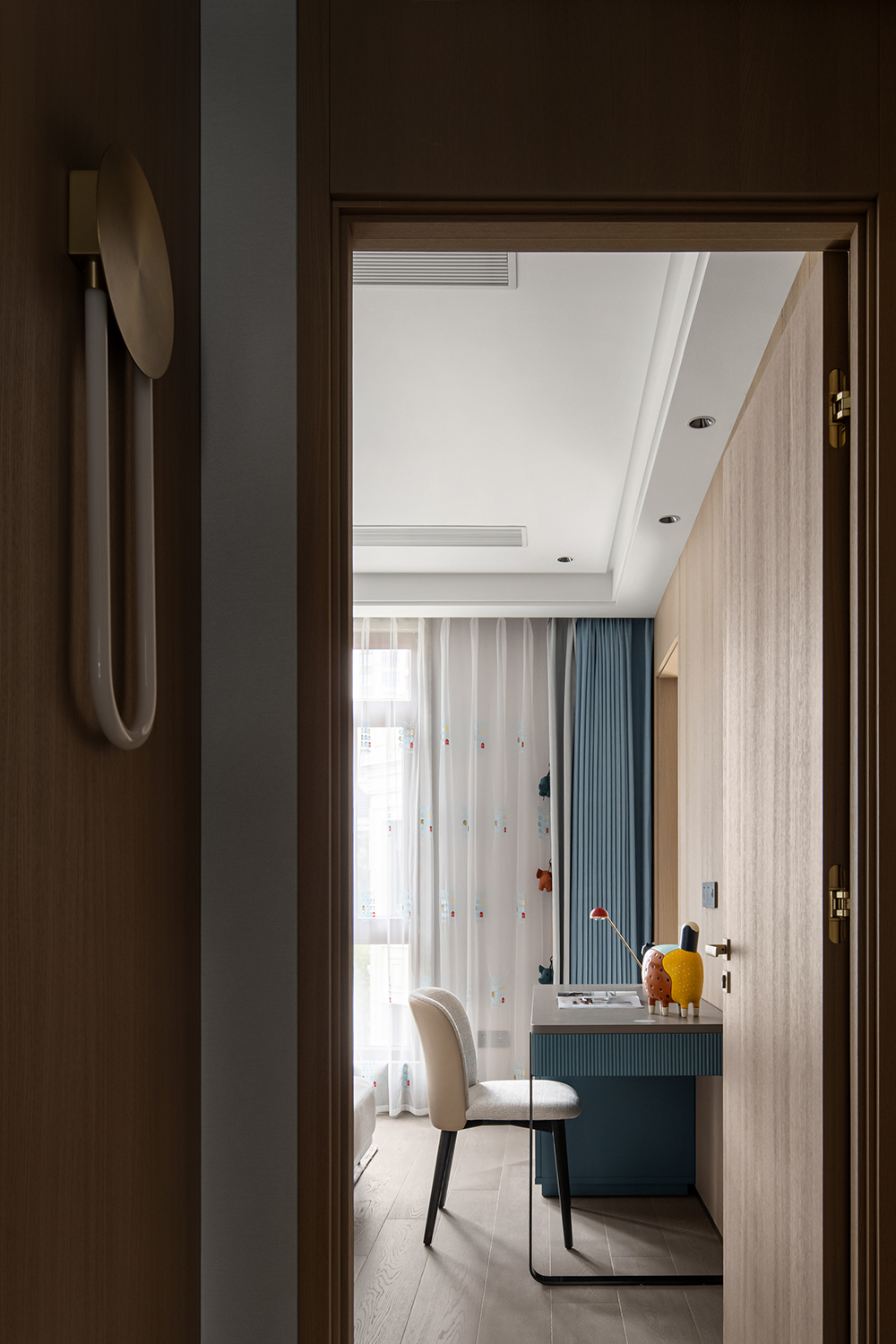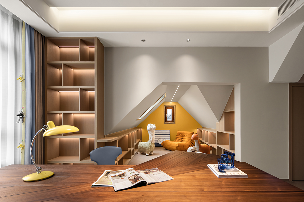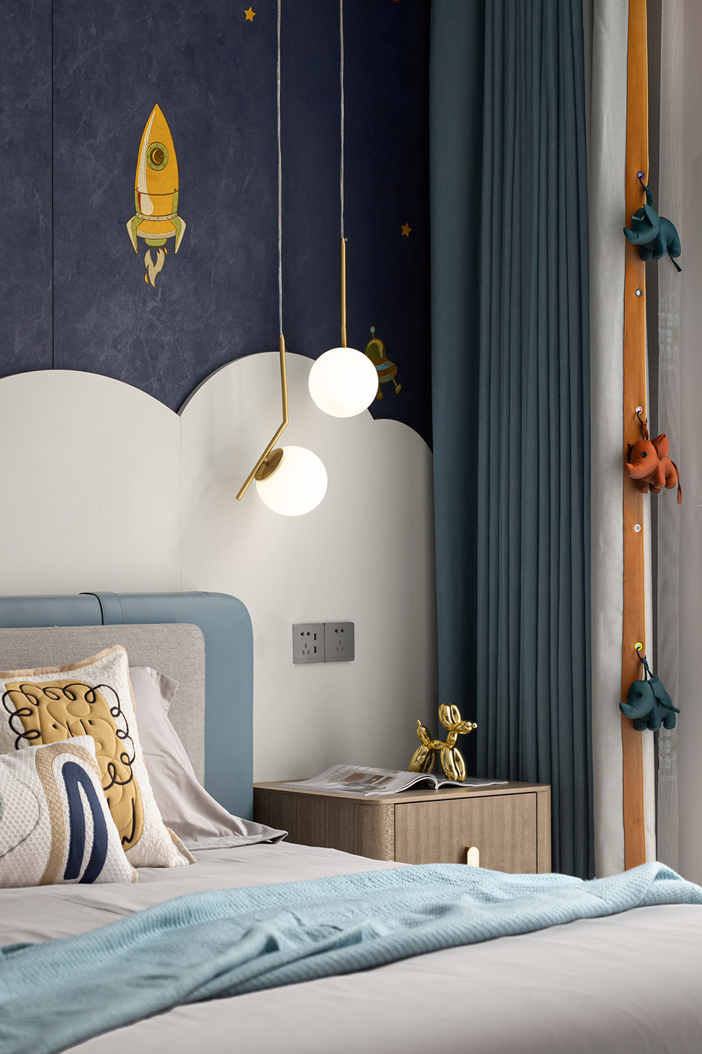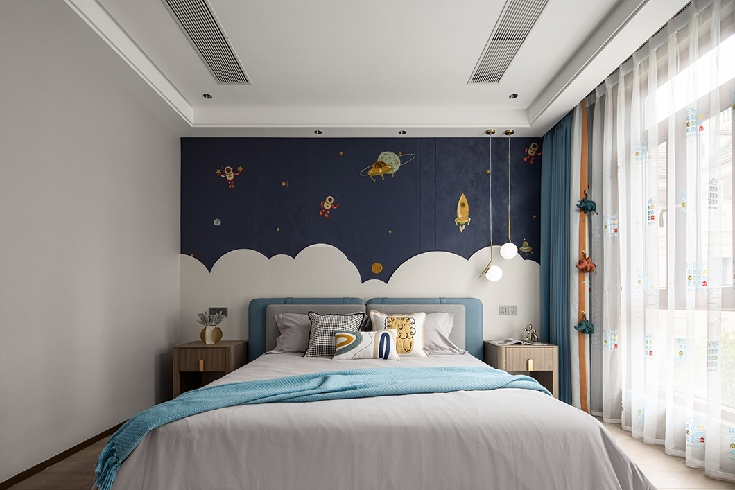 兒童房以“造夢”為設(shè)計(jì)主題,深淺遞進(jìn)的藍(lán)色滿足小男孩對未知星空探索的想象,趣味的動物元素豐富了關(guān)于快樂星球的趣味遐想。活潑的兒童空間搭載著小朋友稚嫩而精彩的夢,還原了孩子應(yīng)有的天真爛漫。