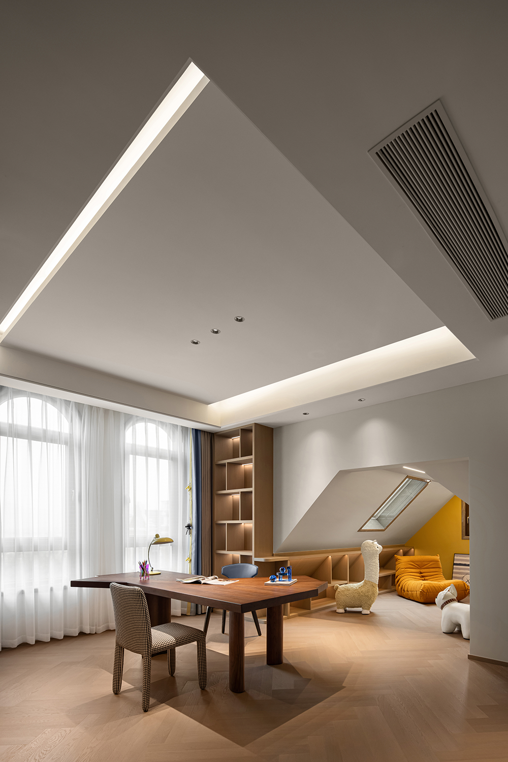吧臺區(qū)兼具休閑,會友,品酒等多層功能。倒弧的木飾面一氣呵成,采光井引入充沛的自然光,賦予空間靈動的光韻,置身通透舒展的吧臺區(qū)品酒,就像被愉快的能量場包圍。